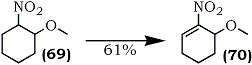 The method is applicable to a variety of acylic and cyclic compounds. For example, 3-methoxy-2-nitrocyclohex-1-ene (70) was obtained from 1-methoxy-2-nitrocyclohexane (69) (Eq. 17).