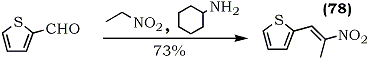 In an approach directed towards the synthesis of the pharmacologically active β-(2-thienyl)ethylamine, the preparation of the precursor, 1-(2-thienyl)-2-nitropropene (78), was improved using 2-thienaldehyde, nitroethane and n-amylamine as the catalyst46 (Eq. 18).The reaction time, at room temperature, is about two weeks.