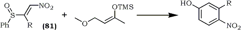 Recently Jung and Grove120 disclosed the preparation and utility of β-phenylsulfinyl- nitroalkenes (81) as nitroacetylene equivalents in Diels-Alder reactions with dienes (Eq. 19). The nitroalkenes were obtained in four steps from acylimidazoles.