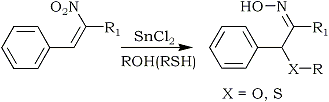 Tin(II)chloride has been used under conventional acidic conditions to produce a mixture of α-substituted oximes and the corresponding saturated nitro compounds135,136. Varma and Kabalka carried out an extensive investigation using tin(II)chloride under a variety of conditions. The tin(II)chloride reduction of conjugated nitroalkenes in alcoholic (and thiol) media afforded α-alkoxy (α-alkylthio) oximes in high yields15 (Eq. 21). Unsubstituted oximes were obtained by using tin(II)chloride in acetone14c.