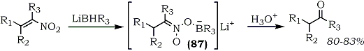 The reaction of lithium tri-sec-butylborohydride with a nitroalkene produces a nitronate intermediate (87) which upon hydrolysis with 4N sulfuric acid affords yet another route to ketones from nitroalkenes (Eq. 24).