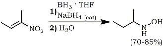 These reactions presumably occur through a common intermediate (88), which can then be hydrolyzed directly to nitroalkanes or reduced with a borane complex to yield hydroxylamines after hydrolysis. Indeed, it was found that sodium borohydride catalyzes the reaction of borane complexes with conjugated nitroalkenes11a (Eq. 26).