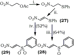 Although successful with α-nitroketones, the method may not be applicable to α-nitroaldehydes because of their instability. Also, it is not possible to prepare 2-(alkylthio)-nitroethylene by this method. A recent report70 describes the first synthesis of 1-nitro-2-(phenylthio)ethylene (27) and the oxidation products, 1-nitro-2-(phenylsulfinyl)ethylene (28) and 1-nitro-2-(phenylsulfonyl)ethylene (29) as shown in Scheme 2.