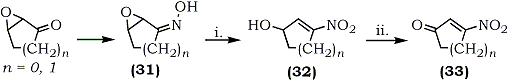 The synthesis of 3-nitrocycloalkenones (33) and their utilization as Diels-Alder dienophiles have been reported by Corey and Estreicher.71 Peroxytrifluoroacetic acid oxidation of the oximes (31) in acetonitrile afforded nitroalcohols (32) which were oxidized in situ using pyridinium chlorochromate as shown in Scheme 3.