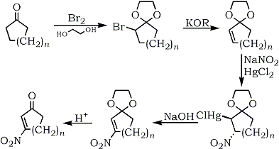 Corey and Estreicher75 reported an elegant synthesis or nitrocycloalkene from cyclic ketones which makes available unsaturated nitro compounds not previously accessible. Allyl nitro compounds can also be obtained using this methodology. The process is outlined in Scheme 6.