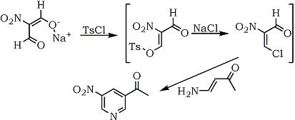 In situ generated nitroalkenes have also been utilized in syntheses. On the basis of a report79 that sodium nitromalonaldehyde is readily acylated with acetic anhydride via the enolic hydroxy tautomer to give the acylal derivative of 3-acetoxy-2-nitroacrolein, 1,3,3-triacetoxy-2-nitro-1-propene, a synthesis of 3-nitropyridines was developed.80 Under anhydrous conditions, tosyl chloride reacted with sodium nitromalonaldehyde in dimethylformamide and pyridine, to produce 3-chloro-2-nitroacrolein which reacted with 4-amino-3-butene-2-one to afford 3-nitro-5-acetylpyridine (53%), Scheme 8. The formation of the initial intermediate, 3-chloro-2-nitro-acrolein, was confirmed by the characterization of a Diels-Alder adduct with cyclopentadiene.