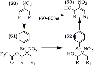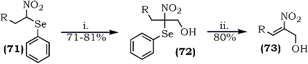 The intermediate nitro(phenylseleno)alkanes (71), bearing an acidic hydrogen, were found to be valuable intermediates for hydroxymethylation112. The α-nitroselenide (71) underwent a smooth condensation with aqueous formaldehyde to give relatively stable 2-nitro-2-phenylselenoalkanols (72). Subsequent selenoxide elimination provided a facile entry to useful hydroxynitroalkenes (73) (Scheme 14).