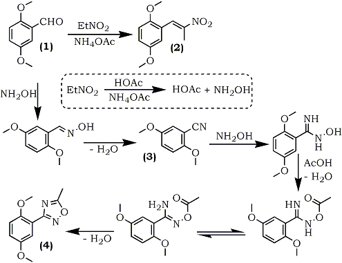 The condensation of 2,5-dimethoxybenzaldehyde (1) with nitroethane and ammonium acetate in glacial acetic acid has been found to give three different products, depending on reactant ratio and reaction time. Using a ratio of 1:1.5:0.8 between the aldehyde, nitroethane, and ammonium acetate, a normal Knoevenagel condensation was observed yielding 70% of the expected 2,5-dimethoxyphenyl- 2-nitropropene (2). At a reactant ratio of 1:3:2 (same reactant sequence), the major product was 2,5-dimethoxybenzonitrile (3) (62%), and at a reactant ratio of 1:40:8, with extended reflux time, the major product was 3-(2,5-dimethoxyphenyl)- 5-methyl-1,2,4-oxadiazole (4) (26%). The mechanism is believed to be dependent on a preliminary reaction wherein the nitroalkane, in the presence of ammonium acetate and acetic acid is converted into the corresponding alkanoic acid and hydroxylamine. Hydroxylamine then converts the aromatic aldehyde, via the intermediary nitrile, to the oxadiazoles following reactions of established precedent (Scheme 1). The second reaction is one reported by Wadia and co-workers.49