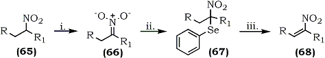 An oxidative transformation of nitroalkanes to nitroalkenes has been reported by Sakakibara and co-workers who used selenium chemistry.111 Phenylselenenyl bromide reacted with the nitronates (66) derived from nitroalkanes (65) to give nitro(phenylseleno)alkanes (67) which upon an oxidative regioselective elimination, using hydrogen peroxide, afforded 1-nitroalkenes (68) in high yield (67-83%) (Scheme 13).