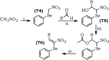 1-Nitro-1-phenylseleno-1-alkenes, a novel group of 1-nitroalkenes bearing a selenyl group at the 1-position have been prepared.113 The α-nitroselenide (74) , on Henry condensation with aldehydes (alkyl and aryl), afforded isomeric mixtures of nitroalcohols (75) which upon acetylation and elimination of acetic acid provided (Z)-1-nitro-1-phenylseleno-alkenes (76) (Scheme 15).