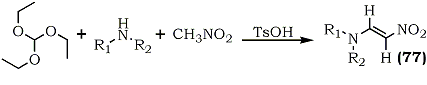 β-Nitroenamines occupy a central position32 among 1-nitro-1-alkenes with hetero atoms at the 1-66 or 2- position.114,115 Rover and co-workers have described a methodology to synthesize nitroenamines (77) via the condensation of triethyl orthoformate, with nitromethane and amines.116 (Scheme 16).