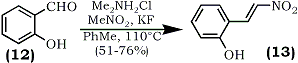 2-(2-Nitroethenyl)phenols (13) were obtained under mild conditions by the reaction of (o-hydroxybenzaldehydes (12) with nitromethane in the presence of dimethylammonium chloride and catalytic amount of potassium fluoride in refluxing toluene64 (Eq. 3).