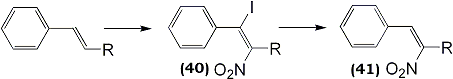 Nitryl iodide, a pseudohalogen reagent, available via the reaction of silver nitrite with iodine was introduced in 193283. The synthetic application of the reagent under mild conditions was described by Hassner and co-workers84 for the selective synthesis of β-iodonitro-, vinylnitro- and nitroalkanes.