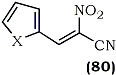 In a continuation of their investigations into the chemistry of cyano-nitroalkenes118, a Russian group has attained the alkenylation of nitro-acetonitrile with a variety of heterocyclic carboxaldehydes in a mixture of absolute ethanol and ether at 20-25°C without the participation of an acidic or basic catalytic agent119. A series of heterylcyanonitroalkenes, i.e. 3-(2-furyl)-, 3-(2-thienyl)-, 3-(2-pyrrolyl)-, (80a-d) etc. were obtained in good yields using this methodology.
