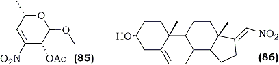 Among various reducing agents employed for the preparation of nitroalkanes, sodium borohydride appears to be the most extensively used. The relatively low cost and the manipulative ease with which it can be handled (one of the least moisture sensitive hydrides) makes it ideally suited for selective reductions. For example, the reduction of (85) to the corresponding nitro sugar (90%), an intermediate in the synthesis of 4-deoxydaunosamine and 4-deoxyristosamine130, and nearly the quantitative conversion of the steroidal nitroalkene (86) to its corresponding saturated derivative77 were achieved using sodium borohydride.