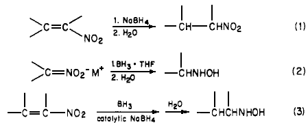 Since catalytic hydrogenation of conjugated nitroalkenes is reported to be a complex reaction2, we investigated the reduction of conjugated nitroalkenes utilizing lithium aluminum hydride3. Unfortunately, in our hands, mixtures were obtained under a variety of conditions. We then investigated the reduction of conjugated nitroalkenes with boron hydrides. It had been reported that the sodium borohyride reduction of a,ß-unsaturated nitroalkenes produces the corresponding nitroalkanes (Eq 1)7, In a later study, Feuer reported5 that nitro salts (nitronates) are readily reduced to hydroxylamines by borane complexes, Eq 2 (i.e, the nitro compounds are unreactive). These reactions presumably occur through a common intermediate 1, which can then be hydrolyzed directly to nitroalkane or reduced with a borane complex to yield hydroxylamine after hydrolysis, It occurred to us that these reactions could be utilized to prepare the desired hydroxylamine directly from the conjugated nitroalkenes.