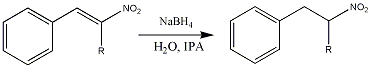 Mix the IPA and water in a sufficiently large beaker. Add the borohydride in one portion and commence stirring. Begin adding the nitrostyrene in small portions after a minute or two. This will cause a rise in temperature and moderate hydrogen evolution. Add the substrate in small portions to avoid any nasty volcano reactions. The rate of addition should be such that a lively evolution of hydrogen can be observed in the beaker, but slow enough to avoid the reaction shooting out of the flask.