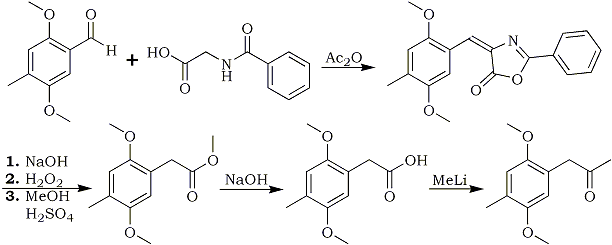 The reaction sequence below is exemplified for the synthesis of the DOM (STP) precursor 2,5-Dimethoxy- 4-methyl-phenyl-2-propanone from 2,5-Dimethoxy-4-methylbenzaldehyde
