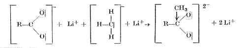 On the addition of methyllithium to the lithium salt of a carboxylic acid, the carbanion with its unshared electron pair adds to the sextet of the carboxylic acid anion, with the formation of a new carbon-carbon bond, and the oxygen with one of its unshared electron pairs forms a bond with the lithium atom The dilithium salt of the dihydroxymethane thus obtained is hydrolysed by water to give the methyl ketone.