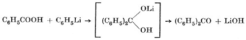 In 1933, Gilman showed that on carbonation phenyllithium yielded 70% benzophenone and no benzoic acid, which is the main product on carbonation of the corresponding magnesium compound. They found that the reason for the high yield of ketone was the higher reactivity of the organolithium compound. If an aryllithium compound was allowed to react with carbon dioxide at temperatures between -50°C and -80°C the following reaction occurred: