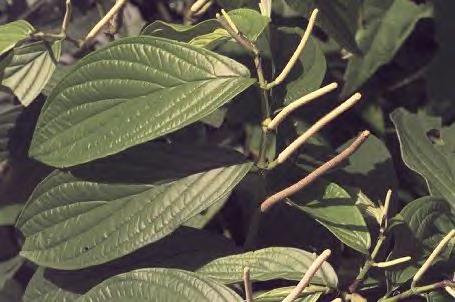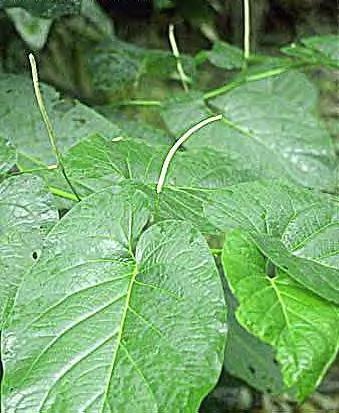 Piper aduncum. That's from aduncus: bent, crooked, curved, hooked. Not because it's a shady character, but because its leaves flop down. It may as well be a shady character, considering all its aliases. It has no fewer than 27(!) synonyms in the published literature, that's binomial Latin nomenclature. The main one is P. angustifolium, these are the same plant. What you asked, its English common name, is Matico pepper (as P. angustifolium), or Spiked pepper (as P. aduncum). In Spanish it's Cordoncillo or Higuillo de Hoja Menuda; Portugese, Aperta-ruao. The Chinese have a name for it, Xia ye hu jiao. Piper auritum