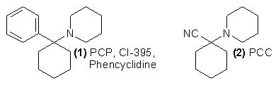 The original chemistry laying the groundwork for the preparation of phencyclidine (PCP, 1) was a study reported in 1926 describing the reaction of 1-piperidinocyclohexanecarbonitrile (PCC, 2) with Grignard reagents1. It was not until some 30 years later that the anesthetic effectiveness of (1) was observed in animals2, and the compound was made available by Parke Davis and Co. under the name of Sernyl (CI-395) for clinical investigation in man.