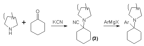 The published preparations of PCP and its analogs may be considered in three groups: those which employ the nitrile (2), those which depend upon the formation of a Schiffs' base as an intermediate, and those which invoke an enamine compound. The most important and most frequently used route to PCP and to its analogs which maintain a cyclic amine function, exploit the facile displacement of the nitrile group from the intermediate (3) with an aryl Grignard reagent6. This method is completely general for cyclic secondary amines (as piperidine and C-alkylpiperidines, pyrrolidine and alkylpyrrolidines, morpholine, and methylpiperazine) and aromatic Grignard reactants (as phenyl, halophenyl, tolyl, anisyl, trifluorotolyl, and thienyl)6,7.