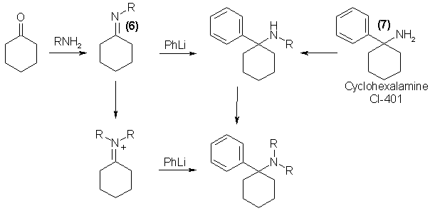 Analogs of PCP with a mono- substituent on the nitrogen are best prepared through the Schiff base intermediate (6) formed from cyclohexanone and the appropriate primary amine6. The introduction of the phenyl group can be achieved with phenyl lithium. The N,N-dialkyl derivatives are easily prepared from their monoalkyl counterparts by methylation or ethylation via N-formylation or N-acetylation and reduction with lithium aluminum hydride (6). In addition, the free amino compound (7) can be employed for the synthesis of either mono- or dialkyl products; amide formation followed by reduction yields monoalkyl isomers, and reductive methylation (with formaldehyde and formic acid) will provide dimethylation7. If the Schiffs' bases are reacted with an alkyl halide, a quaternary salt results, and this, upon reaction with phenyl lithium, will provide a mixed N,N-dialkyl analog of PCP.