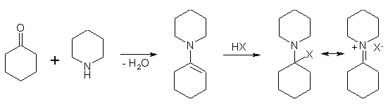 Yet another scheme is known for the synthesis of this class of compounds. An enamine is prepared by the dehydration of equimolar quantities of piperidine and cyclohexanone. The addition of anhydrous p-toluene sulfonic acid or of hydrogen bromide to this system produces an adduct from which PCP can be obtained by displacement with a Grignard reagent9.