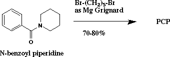 This is a promising underutilized method which takes place in one step (ref. 59-61,67). The starting material is N-benzoylpiperidine, which may be easily prepared in ~90% yield from benzoyl chloride and piperidine (ref. 68) or purchased commercially. Reaction of N-benzoylpiperidine with the lithium or magnesium organometallic derivative of 1,5-dibromopentane gives PCP. The only difficulty in this route is the preparation of the dibromopentane Grignard reagent, with its strict requirement for anhydrous conditions. This route has an overall yield of ~75% with a difficulty rating of 2 out of 10, and a hazard rating of 2 out of 10 (ref. 64).