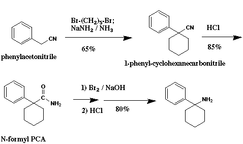 Chemistry: In the first step, phenylacetonitrile is reacted with 1,5-dibromopentane and strong base to yield 1-phenyl-1-cyclohexanecarbonitrile. The base can be either NaNH2 (sodamide; 65% yield) or sodium hydride in anhydrous DMSO (better). If NaNH2 is used it may be purchased commercially or prepared from sodium metal and liquid ammonia (-30 C).
