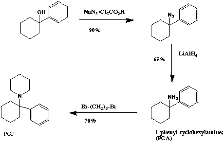 The PCOH starting material can be purchased or prepared by reaction of phenyllithium or phenyl grignard with cyclohexanone. This alcohol is then be transformed into the amine by reaction with sodium azide (~90% yield) followed by reduction. The azide is easily reduced to the final amine by a number of reagents, such as Raney Nickel, Pd/C, magnesium metal, lithium aluminum hydride, or sodium borohydride (ref. 50-54).