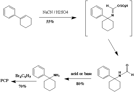 This method is generally easy, and starts with inexpensive and commercially available 1-phenylcyclohexene, or alternately from1-phenylcyclohexanol (PCOH) (ref. 10, 56, 58, 65). PCOH or phenylcyclohexene is reacted with sodium cyanide and H2SO4 to give N-formyl PCA in about 50-60% yield. N-formyl PCA is readily hydrolyzed in either acid or base conditions to give PCA, which can then be alkylated to give PCP and other analogs, as illustrated in Scheme IV. This route has an overall yield of ~30% with a difficulty rating of 1-2 out of 10, and a hazard rating of 3 out of 10 (ref. 64).