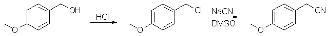 p-Anisyl alcohol (100 g, 0.725 mole) was shaken with 500 ml of concd HCl for 2 min. The organic phase was washed with H20, 5% NaHCO3 and H2O then added over 40 min to a stirred slurry of 49 g (1.0 mole) of NaCN in 400 ml of DMSO [2], with ice-water cooling to maintain the temp at 35-40°. After addition was complete, the cooling bath was removed, the mixture was stirred for 90 min and then added to 300 ml of H20, and the small upper phase separated. The aqueous DMSO layer was extracted with two 100-ml portions of Et2O which were combined with the product layer, and the whole was washed once with H20 and dried (MgSO4). p-Methoxy-phenylethylamine