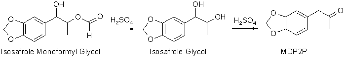 To convert the isosafrole glycol ester to MDP2P, the reaction mixture is heated for a few hours with a dilute (15% w/w) aqueous sulfuric acid (H2SO4) solution, where the ester