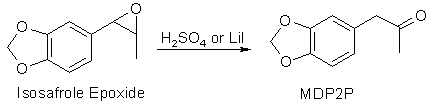 first is hydrolysed to isosafrole glycol, which under the influence of the strong acid undergoes dehydration (water elimination) and rearrangement to form MDP2P in a reaction called