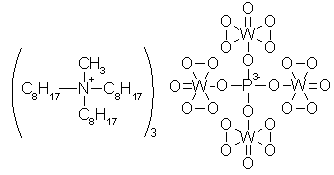 A suspension of tungstic acid (2.50g, 10 mmol) in 7 ml of 30% aqueous H2O2 was stirred and heated to 60°C until a colorless solution was obtained. To this solution, filtered and cooled to room temperature, was added 40% w/v H3PO4 (0.62ml, ca 2.5 mmol), and the whole was diluted to 30 ml with water. To the resultant soluton, 2.09g of methyltrioctylammonium chloride (Aliquat 336, 97% pure, equivalent to 2.027g, 5 mmol) in DCM (40 ml) was added dropwise with stirring over about 2 min. Stirring was continued for an additional 15 min. The organic phase was then separated, dried over Na2SO4, filtered, and gently evaporated on a rotary evaporator under reduced pressure at 40-50°C (bath temp) to give 3.70 g (98.4%, based on the quaternary ammonium salt charged) of an almost colorless syrup.