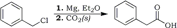 10% of a solution of 125 g Benzyl Chloride in 250 ml of sodium-distilled diethyl ether is added to 24 g magnesium turnings under 100 ml ether, and a small iodine crystal is added. after start of the grignard reaction the rest of the benzyl chloride is added with stirring to maintain gentle boiling (if the reaction becomes too vigorous, useless 1,2-diphenylethane is formed) and the mixture is heated and stirred until most magnesium is dissolved. The grignard reagent solution is poured on 1 kg water-free, crushed dry ice (solid CO2) and stirred for 2 h. 200 ml warm ether is added and the mixture is heated in a water-bath until the internal temperature reaches 25°C. 200 ml 32% hydrochloric acid is added, and the heterogenous mixture stirred until any inorganic precipate is dissolved. after filtering, the organic layer is separated, washed with cold water, and dried over 20 g anhydrous sodium sulfate. The ether is distilled off, and the rest is recrystallized from water, to yield 75% (about 100g) of phenylacetic acid, mp 76-77°C.