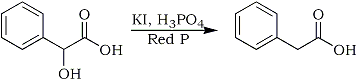 15 grams Mandelic Acid (0.1 mol), 2.07g KI (6.25% of theory), and 6g Red Phosphorous is dissolved in a solution of 70ml phosphoric acid and 10 ml of water, and this solution is refluxed for six hours (bp of soln 144°C). After the reaction mixture has cooled down, a little water is added to dissolve precipitated inorganic salts. The solution is extracted with ether, and the pooled extracts washed with a little dilute NaHSO3, followed by water, and is then dried over Na2SO4. The ether is removed under diminished pressure and the residue is distilled (bp 138-139°C/13mmHg). The yield is 12.5 grams (90%) of phenylacetic acid melting at 76°C. 3.2 grams of phosphorous could be recovered from the aqueous solution.