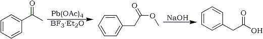 4.56g (38 mmol) acetophenone, 10ml methanol, 22g (150 mmol, 20ml) BF3·Et2O (boron trifluoride etherate) is added in one potrion to a magnetically stirred suspension of 17.7g (40 mmol) lead tetraacetate in 100ml benzene. The reaction mixture is stirred at room temp for 5h, diluted with 500ml cold water, extracted with 600ml benzene, washed with 150ml satd. NaHCO3, 200ml satd. NaCl, and then dried over sodium sulfate and filtered. Evaporation of the solvent and vacuum distillation of the residue gave methyl phenylacetate in 86% yield, bp 94-96°C/5mmHg.