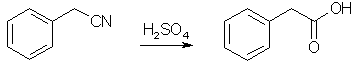 In a silica basin of about 35 cm diameter, a mixture of 2.5 kilos of Benzyl Cyanide and 7.5 kilos of 70% sulfuric acid is warmed until a few bubbles of gas appear. The heating is at once stopped, since a very vigorous action now ensues. As the vapors evolved are injurious to health, the basin is covered when the reaction begins with a sliding cover from which the vapors can be led into water. As soon as the reaction ceases, the product is poured upon crushed ice in a large, earthenware vessel. Crude phenylacetic acid, contaminated on the surface with phenyl acetamide, is precipitated on cooling. In order to remove the amide, the acid is dissolved in lukewarm dilute soda solution. The amide remains undissolved and can be filtered off, while the phenyl acetic acid goes into solution as sodium salt and is reprecipitated in a sufficiently pure state by the addition of dilute mineral acid. After drying it is acceptably pure.