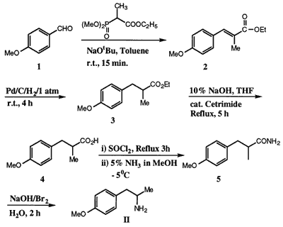 Horner–Wadsworth–Emmons reactionThe Horner–Wadsworth–Emmons reaction of 1 with ethyl (2-dimethoxyphosphinyl)-2- propanoate10 (1.1 mol equiv.) and NaOtBu (1.5 mol equiv.) in toluene at room temperature for 15 min gave the α,β-unsaturated ester 2 which on catalytic hydrogenation (1 atm.) with 10% Pd/C in MeOH for 4 h gave the saturated ester 3, while progress of the reaction was monitored by HPLC (experimental). Hydrolysis of 3 with aq. NaOH (20%) and a catalytic amount of cetrimide at reflux temperature for 5 h gave the acid derivative 4. Compound 4 was transformed to the amide 5 (mp: 119–121°C) by reaction with SOCl2 followed by quenching with methanolic ammonia solution at -5°C. Hoffman degradation of amide 5 by reaction with NaOBr at 70°C for 2 h gave the amine II in 67% overall yield from p-anisaldehyde (1).