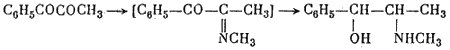The α-bromopropiophenone (III) formed by reaction (b) is methylaminated in the same vessel.; this reaction gives α-methylaminoethyl phenyl ketone (ephedrone) in 70-74% yield on the propiophenone taken. Ephedrone is reduced by molecular hydrogen in presence of Raney nickel catalyst (c). The yield of DL-ephedrine in this reaction, calculated on the ephedrone taken, is 64%; 19% of DL-pseudophedrine, to be converted into DL-ephedrine, is also obtained.