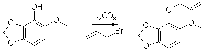 6g 6-Methoxy-2,3-Methylenedioxyphenol, 40g K2CO3 and 250ml dry acetone was stirred for 10 min, 8ml allylbromide added and refluxed for 18h. The resulting product gave 8g of 1-Allyloxy-6-Methoxy-2,3- Methylenedioxybenzene as a colorless oil after purification. 6-Methoxy-2,3-Methylenedioxy-4-allylphenol