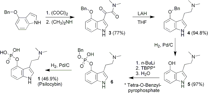By contrast, the synthesis of psilocybin, N,N-dimethyl-4-phosphoryloxytryptamine (1), is more challenging. Nevertheless, psilocybin has pharmacological features that make it attractive for clinical research, including a relatively short duration of action. The increasing worldwide popularity of psilocybin-containing mushrooms as recreational drugs also points to the need for more research with psilocybin. We re-examined the synthesis of psilocybin reported by Hofmann and coworkers4. Although their approach still remains useful, there were several weak points that could be addressed to improve the yields and purities of the final compound.