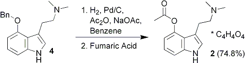 As a potential replacement for (1), 4-Acetoxy-N,N-dimethyltryptamine fumarate (2) was conveniently prepared by shaking under hydrogen a mixture of 4, acetic anhydride, and sodium acetate in benzene with Pd/C in a Parr low pressure hydrogenation apparatus. Following uptake of the required amount of hydrogen corresponding to O-debenzylation, the catalyst and insoluble salts were removed by filtration. One molar equivalent of fumaric acid was added to the filtrate, and the solution was concentrated to dryness under vacuum. The resulting solid was recrystallized to afford white crystals of the desired product. This material was stable when stored in the cold, but slowly darkened on storage for several months at ambient temperature.