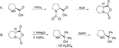Synthesis:(S)-Diphenyl-2-pyrrolidinyl-methanol [1] ![]() Phenylmagnesium bromide was prepared from 61g Mg and 372g bromobenzene in 2L ether. Then 0.7L anisol is added, and the major part of the ether is distilled off. Then a solution of 52.2g (S)-proline ethyl ester in 80ml anisol is added, under light reflux. After 30 minutes of reflux one pours the solution into a solution of 1000g crushed ice and 372ml concentrated hydrochloric acid , filters, dissolves the precipitate in hot water and makes the solution basic with ammonia in the presence of ether. The ether layer is decanted and evaporated dry. The residue is washed with ethanol and dried. Thus obtained is 20g of (S)-diphenyl-2-pyrrolidinyl-methanol, in the form of colorless crystals. (S)-Diphenyl-2-pyrrolidinyl-methane [1] ![]() Into a solution of 125g (S)-diphenyl-2-pyrrolidinyl-methanol in 450ml acetic acid is added 1265ml of a solution of HI in 2N acetic acid. This is then heated to 115°C on the oil bath for 5 minutes and then cooled quickly. To the cooled mixture is added 1260ml of a saturated solution of sodium thiosulphate, and then evaporated to dryness. The residue is put into 630ml water and filtred. The precipitate is dissolved in 1000ml of methanol, and filted. The organic phase is made basic with soda. Then 600ml water is added, the methanol is removed by distillation, and the aquous solution is extraced with ether. The ether solution is evaporated to dryness. Thus obtained is 115g of crude (S)-diphenyl-2-pyrrolidinyl-methane. This is dissolved in dry ether and concentrated hydrochloric acid is added until PH = 4, and then filtered. The precipitate is dried and washed with acetone and ether. The hydrochloride is purified by recrysalisation from boiling water. One obtains 70 to 80g of the hydrochloride of (S)-diphenyl-2-pyrrolidinyl-methane. Synthesis of (S)-2-(Diphenylhydroxymethyl)pyrrolidine [3](S)-1-(Trimethylsilyl)pyrrolidinyl-2-trimethylsilylcarboxylate ![]() 11,5 g (100 mmol) (S)-Proline and 34,90 g (240 mmol) N,N-diethyl-trimethylsilylamine were heated in an oil bath at 110-120°C, and the formed diethylamine was continuously distilled off. After 6h the heating was terminated since no more diethylamine was formed. Vacuum distillation of the residue gave 24.53 g (94.5%) of (S)-1-(trimethylsilyl)pyrrolidinyl-2-trimethylsilylcarboxylate (bp 97°C/14 mbar) as a very hydrolysis-sensitive clear liquid. (S)-2-(Diphenylhydroxymethyl)pyrrolidine ![]() The Grignard complex prepared from 7.29 g (300 mmol) magnesium and 47,1 g (300 mmol) bromobenzene in 350 ml absolute Et2O was added dropwise to 19.46 g (75 mmol) of the above ester in 30 ml absolute Et2O at 0-20°C under argon atmosphere. The reaction solution was heated under reflux for 4h, cooled to 0°C and poured slowly with stirring into 450 ml 2N ice-cold hydrochloric acid (360 g ice + 90 ml conc. HCl). The white precipitate was filtered by suction, washed with methyl tert-Butylether, water and recrystallized from Methanol/methyl tert-Butylether. By collecting several fractions, there was obtained 14,26 g (49,2 mmol) of crude (S)-2-(Diphenylhydroxymethyl)pyrrolidine.HCl with a purity of 65.6%, mp 285-290°C. The crude (S)-2-(Diphenylhydroxymethyl)pyrrolidine.HCl was added to a mixture of 100 ml 1N NaOH, 5 ml triethylamine and 200 ml methyl tert-Butylether, and the mixture stirred until two clear phases formed (about 5h). The phases were separated and the aqueous phase extracted twice with methyl tert-Butylether. The pooled organic phases were washed twice with 20% aqueous NaCl solution, dried over MgSO4, filtered and the solvent removed under vacuum at a bath temp of 40°C. The residue was taken up in hot n-heptane, and upon cooling clear, yellowish crystals precipitated. Thus, there was obtained 12.01g (63%, 47.5 mmol) of (S)-2-(Diphenylhydroxymethyl)pyrrolidine (mp 76.5-78°C). DL-alpha-(2-Pyrrolidyl)benzhydrol Hydrochloride [4]![]() dl-Proline ethyl ester (4.7g) was added dropwise at room temp to a stirred solution of phenylmagnesium bromide (4 molar equivalents) in ether. After addition of the ester, the mixture was boiled under reflux for 2h and then hydrolyzed with dilute ammonium chloride. The ether layer was separated and the aqueous solution extracted thrice with toluene. The combined extracts wre was washed with water, dried over sodium sulfate and evaporated in vacuo to yield an oil (4.5g). It was converted to the hydrochloride and recrystallized from methanol-ether, mp >250°C. An aliquot of the hydrochloride salt converted to the free base and recrystallized from ethanol-water had mp 81-82°C (lit. [5] mp 83°C). (S)-1,1-Diphenylprolinol [7]![]() A. N-(tert-Butoxycarbonyl)pyrrolidine. A 500-mL round-bottomed flask, equipped with magnetic stirring bar, is charged with dichloromethane (CH2Cl2) (120 mL) and pyrrolidine (11.3 mL, 133 mmol) (Note 1). The flask is fitted with a 60-mL, pressure-equalizing addition funnel vented through a mineral oil bubbler and charged with a solution of di-tert-butyl dicarbonate (24.6 g, 112 mmol) in CH2Cl2 (35 mL) . After the pyrrolidine solution is cooled to 0°C in ice, the colorless dicarbonate solution is added dropwise over a period of 30 min, and the resulting solution is stirred at room temperature for 3 hr (Note 2). The solvents are then removed under reduced pressure, and two consecutive Kugelrohr distillations of the residual oil (oven temperature 80°C at 0.2 mm) afford 16.6 g (87%) of N-Boc-pyrrolidine as a colorless oil (Note 3). B. (R)-(+)-2-(Diphenylhydroxymethyl)-N-(tert-butoxycarbonyl)pyrrolidine. An oven-dried, 2-L, three-necked flask, equipped with a magnetic stirring bar and a thermocouple (Note 4), is charged with (-)-sparteine (30.2 mL, 131 mmol) (Note 5), N-Boc-pyrrolidine (15.0 g, 87.6 mmol), and anhydrous ether (900 mL) (Note 6). The solution is cooled to -70°C (dry ice/acetone bath) (Note 4). To this solution is added sec-butyllithium (96 mL, 1.16 M in cyclohexane, 111 mmol) (Note 7) and (Note 8) drop