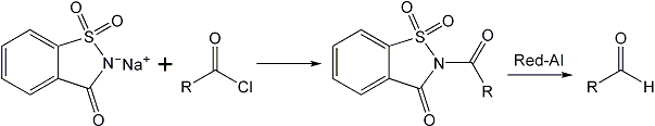 An aldehyde synthesis introduced by Staab10, involves the reduction of N-acylimidazole. Recently, the trans-acylation reactions of N- acylsaccharin were reported from these laboratories11 and the reactivity of N-acyl saccharin has been found to be comparable to that of N- acyl imidazole. It has now been found that the N-acyl saccharin can be synthesized in one-step from the carboxylic acid and y-saccharin chloride which is easily prepared9. N- acyl saccharins thus synthesized can be reduced in high yields to the corresponding aldehydes by sodium bis-(2- methoxyethoxy)-aluminum hydride (Red-Al). This provides a convenient and one-step synthesis of aldehyde from the carboxylic acid. The main advantage of the proposed method is combining of the two reactions, i.e., the preparation of N-acyl compound and its reduction in one step. The reductions are successfully carried out at 0-5°C, whereas in many cases, temperatures as low as –70°C have to be employed. The method has been successfully applied for the reduction of aliphatic, alicyclic, aromatic, and alpha, beta-unsaturated acids to the corresponding aldehydes.