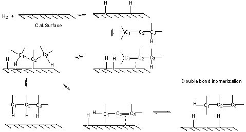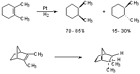Mechanism and Stereochemistry: In general, there is overall cis addition of H2 across C=C from less hindered side.