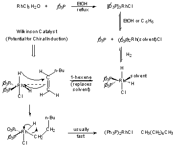 Homogeneous Catalyst Hydrogenation: Wilkinson's Catalyst: tris-(triphenylphosphine)rhodium chloride soluble in organic sovlents (EtOH, etc.) Preparation and reaction: